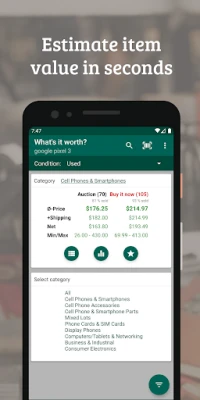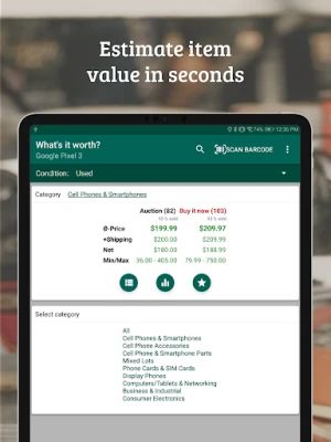 Perfect to find out what you can earn selling something, or to check if a promising bargain really is one. The ideal app for any powerseller, sales agent, ambitioned eBayer and for use on flea markets, yard sales and more ...
